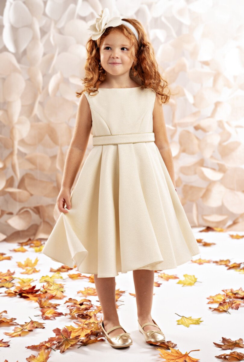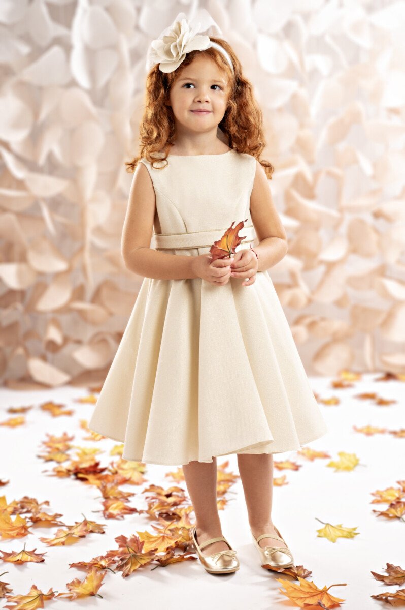 *Το μεγάλο, χειροποίητο χρυσό λουλούδι για τα μαλλιά ολοκληρώνει την εμφάνιση, σαν στέμμα μικρής
