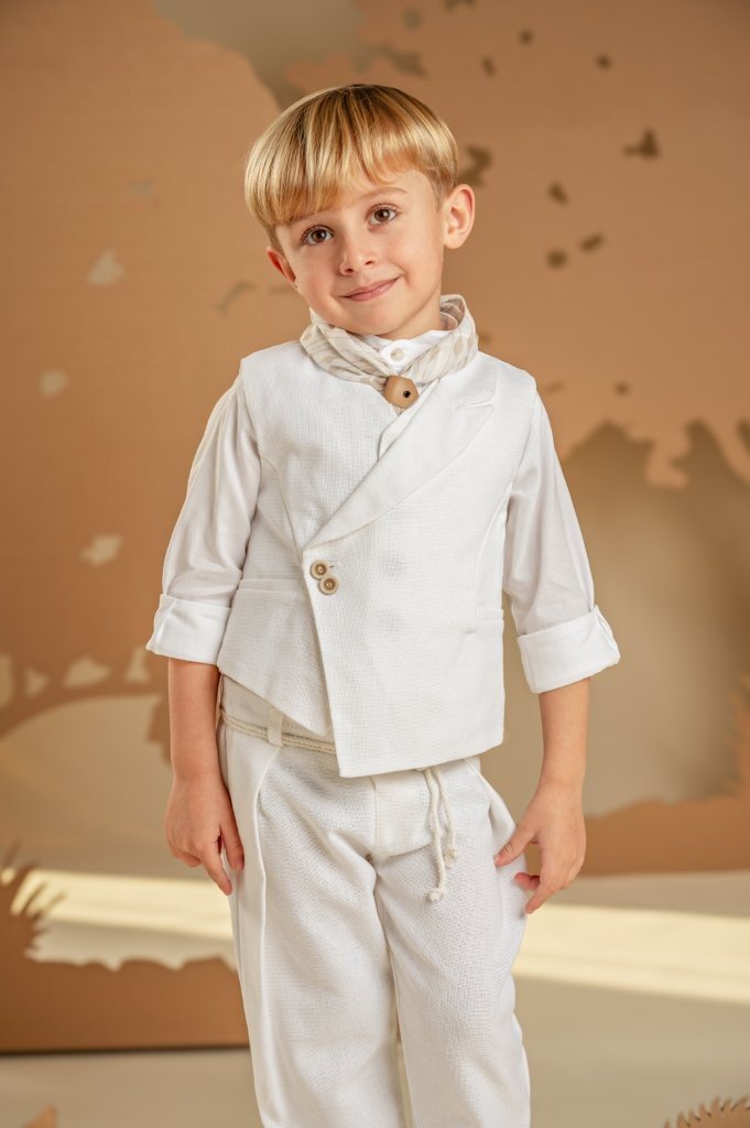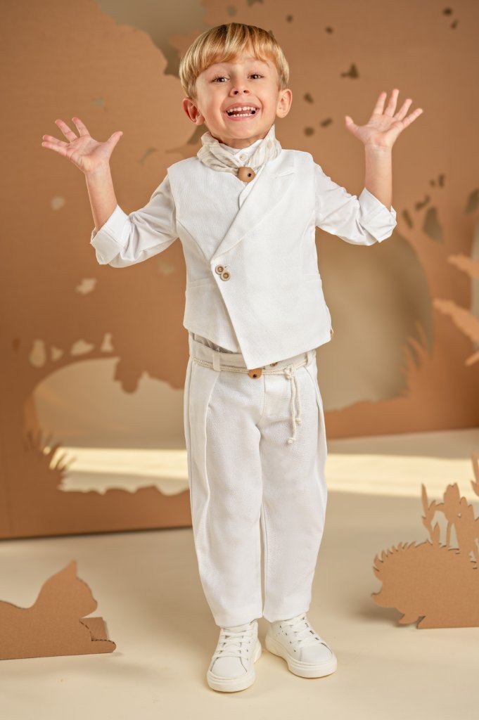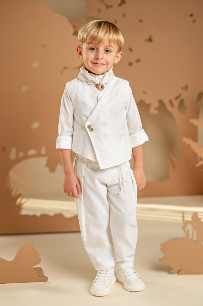 Ένα σετ ιδανικό για τους μικρούς κυρίους με ξεχωριστό γούστο και σύγχρονο στυλ. Το baggy παντελόνι με ιδιαίτερες reverse πιέτες και ζώνη από κορδονέτο, σε συνδυασμό με το σταυρωτό γιλέκο με λοξό κούμπωμα και μονό πέτο, και τα δύο από βαμβακερό ύφασμα σε off white απόχρωση, δημιουργούν ένα μοναδικό αποτέλεσμα. Το βαμβακερό πουκάμισο με ιδιαιτερο Mao γιακά και το exclusive εμπριμέ φουλάρι Baby Bloom σε λευκή-μπεζ απόχρωση ολοκληρώνουν το look. Για την τελευταία πινελιά, επιλέξτε ανάμεσα σε ψάθινο καπέλο ή υφασμάτινη τραγιάσκα, ανάλογα με το προσωπικό σας στιλ.