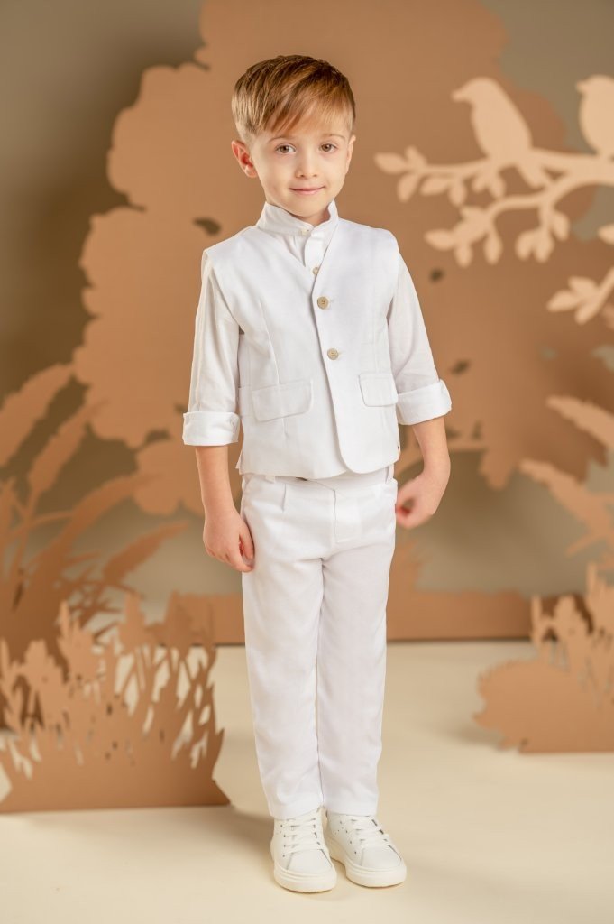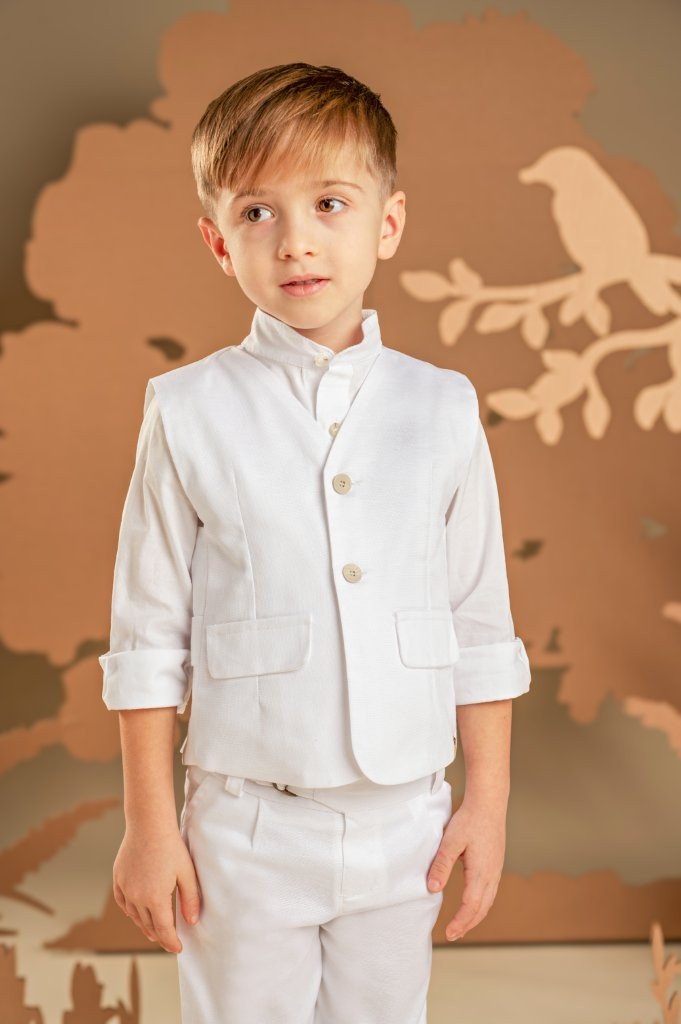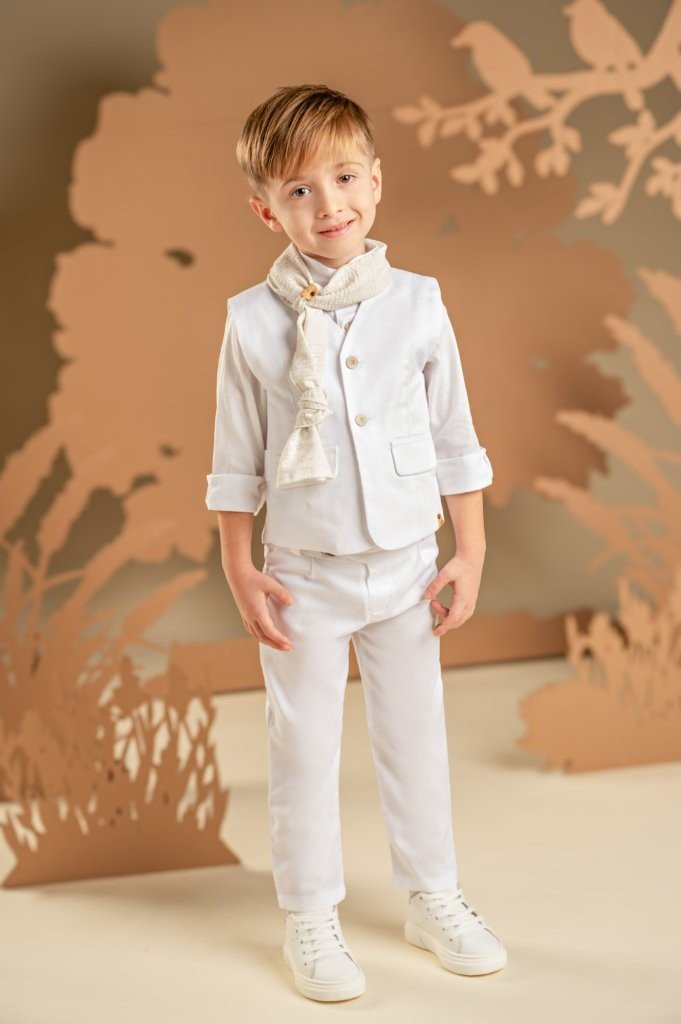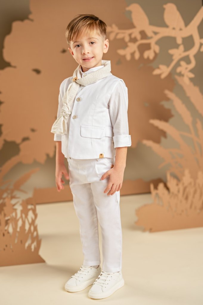 Ένα all time classic αλλά συγχρόνως μοναδικά μοντέρνο σετ, φτιαγμένο εξολοκλήρου από λευκό Tencel-cotton-linen ύφασμα. Το σύνολο περιλαμβάνει, παντελόνι ίσιο που ξεχωρίζει για τη λεπτομέρεια στη ζώνη, πανέμορφο γιλέκο με ζώνη πίσω, λευκό βαμβακερό πουκάμισο με Mao γιακά και γκοφρέ φουλάρι σε μπεζ αποχρώσεις. Για την τελική πινελιά, επιλέξτε ανάμεσα σε ψάθινο καπέλο ή υφασμάτινη τραγιάσκα, ανάλογα με το προσωπικό σας στυλ.