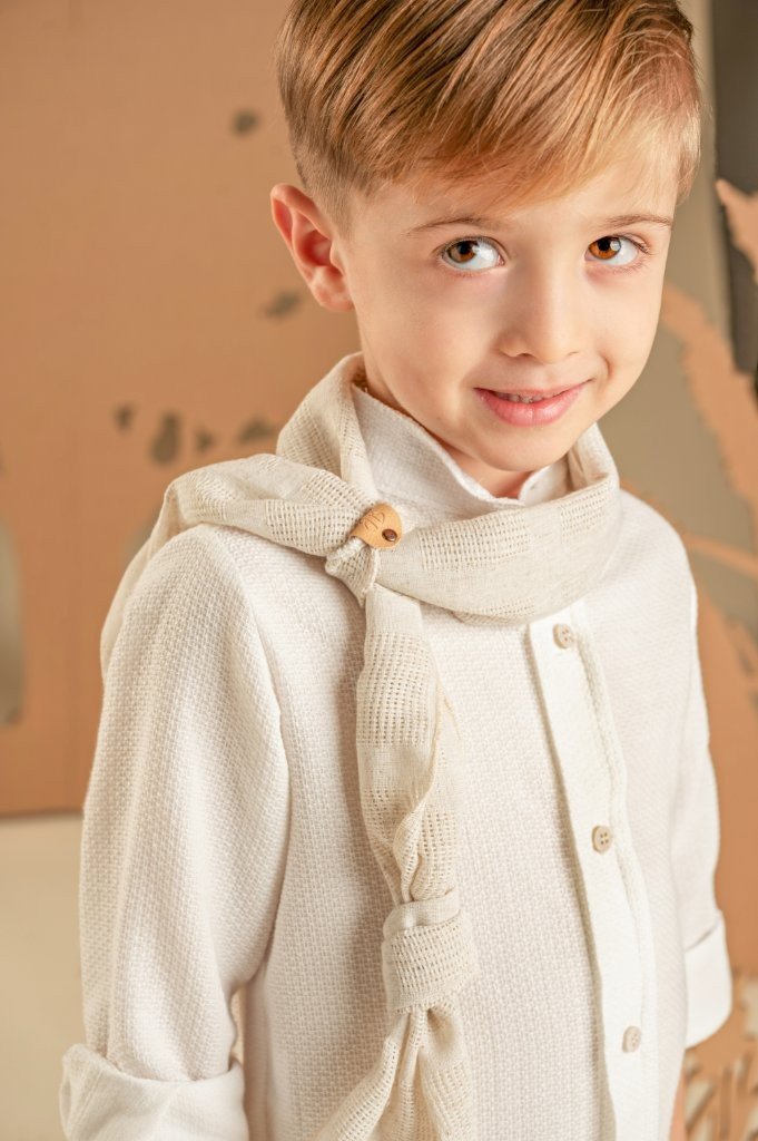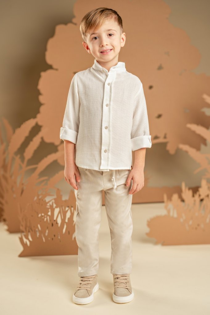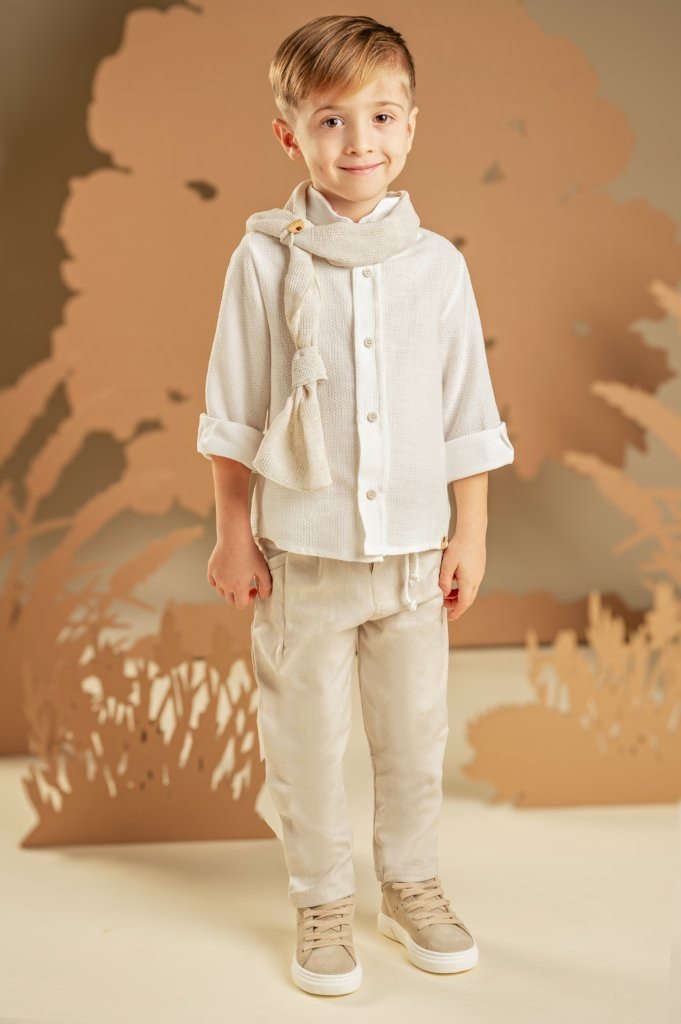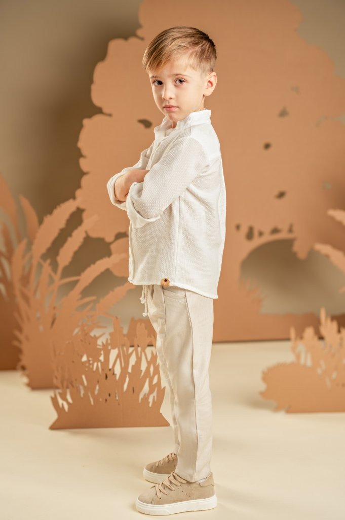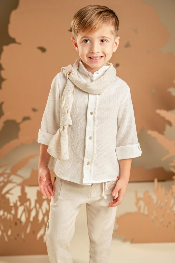 Ένα χαλαρό και casual look για αυτούς που προτιμάνε μια καλοκαιρινή εμφάνιση. Το σετ αποτελείται από παντελόνι σε μπεζ χρώμα από cotton-tencel-linen ύφασμα και πουκάμισο από υπέροχο πλεκτό πικέ ύφασμα με Μάο γιακά σε off white χρώμα. Το σύνολο ολοκληρώνεται με το μακρόστενο υφαντό φουλάρι σε μπεζ χρώμα και ανάλογα με το στιλ που προτιμάτε, ψάθινο καπέλο ή υφασμάτινη τραγιάσκα .