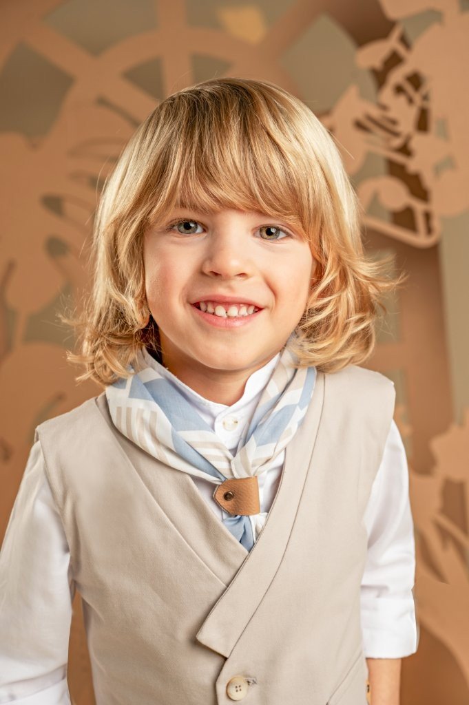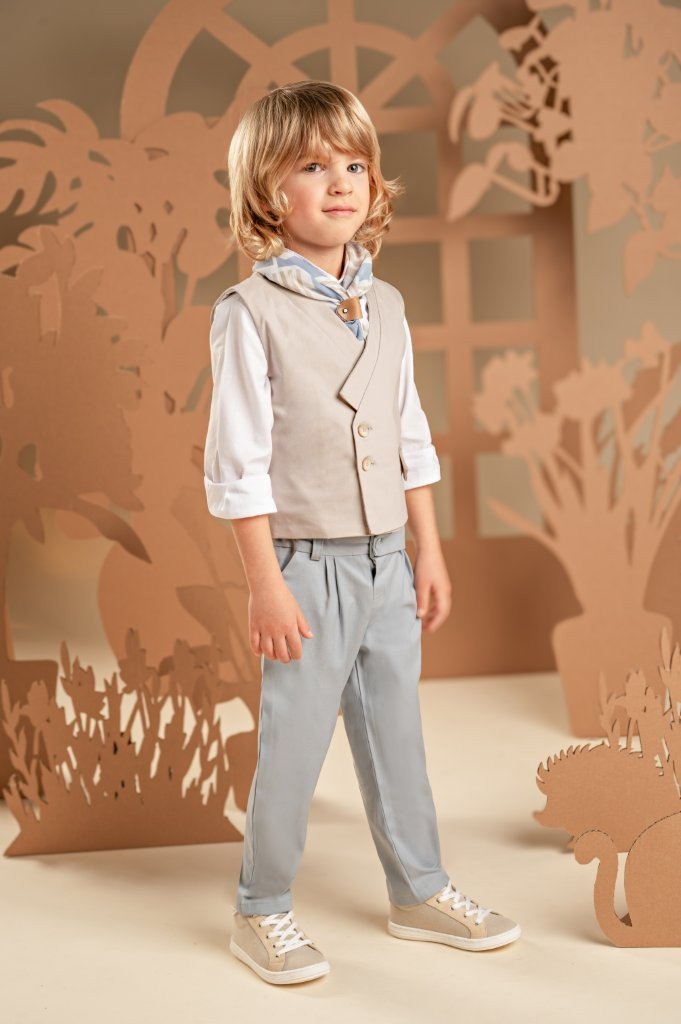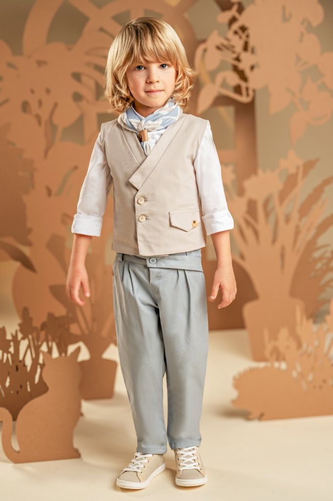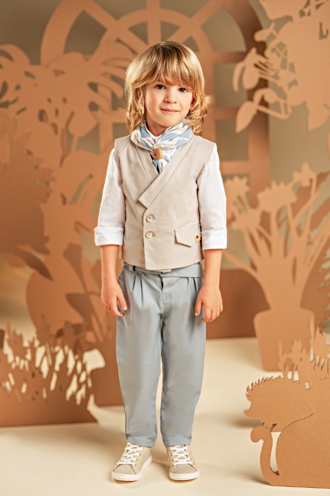 Ένα σύνολο που φέρνει νέα πνοή στη διαχρονική κομψότητα με απαλούς χρωματικούς συνδυασμούς και υπέροχο design.Το δίπιετο παντελόνι με την έξτρα λοξή ζώνη σε γκρι-σιελ απόχρωση από Tencel-viscose ύφασμα και το σταυρωτό γιλέκο με τον γιακά κιμονό σε μπεζ βαμβακερό ύφασμα δημιουργούν ένα εξαιρετικό σύνολο. Το λευκό βαμβακερό πουκάμισο και το φουλάρι με γεωμετρικά σχέδια σε σιελ αποχρώσεις με exclusive τύπωμα Baby Bloom ολοκληρώνουν μοναδικά το look. Για την τελική πινελιά, επιλέξτε ανάμεσα σε ψάθινο καπέλο ή υφασμάτινη τραγιάσκα, σύμφωνα με το προσωπικό σας στυλ.