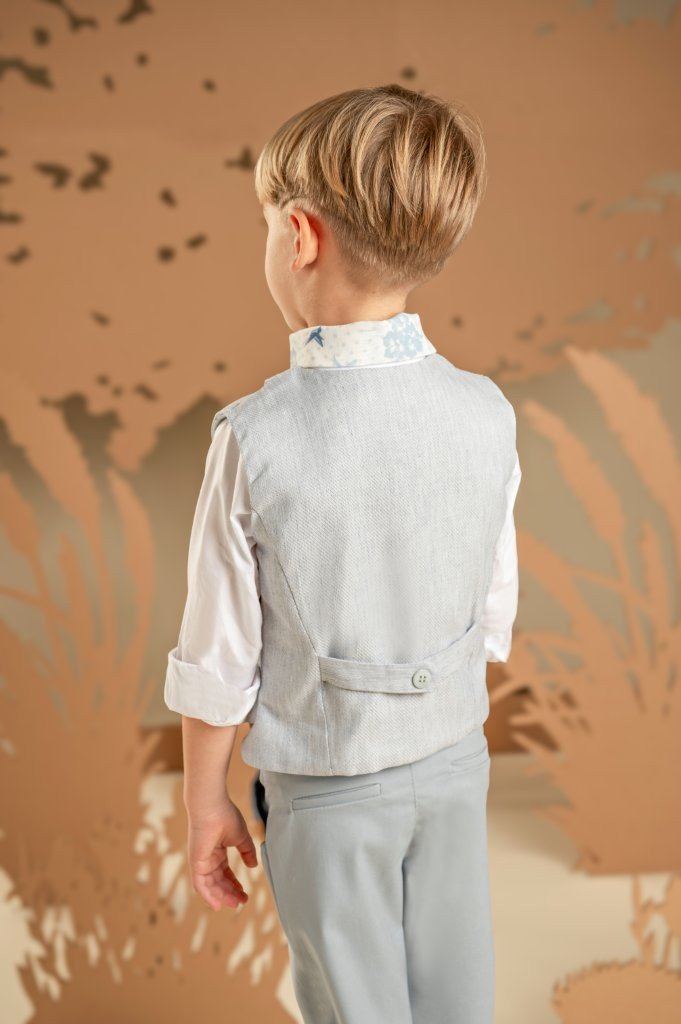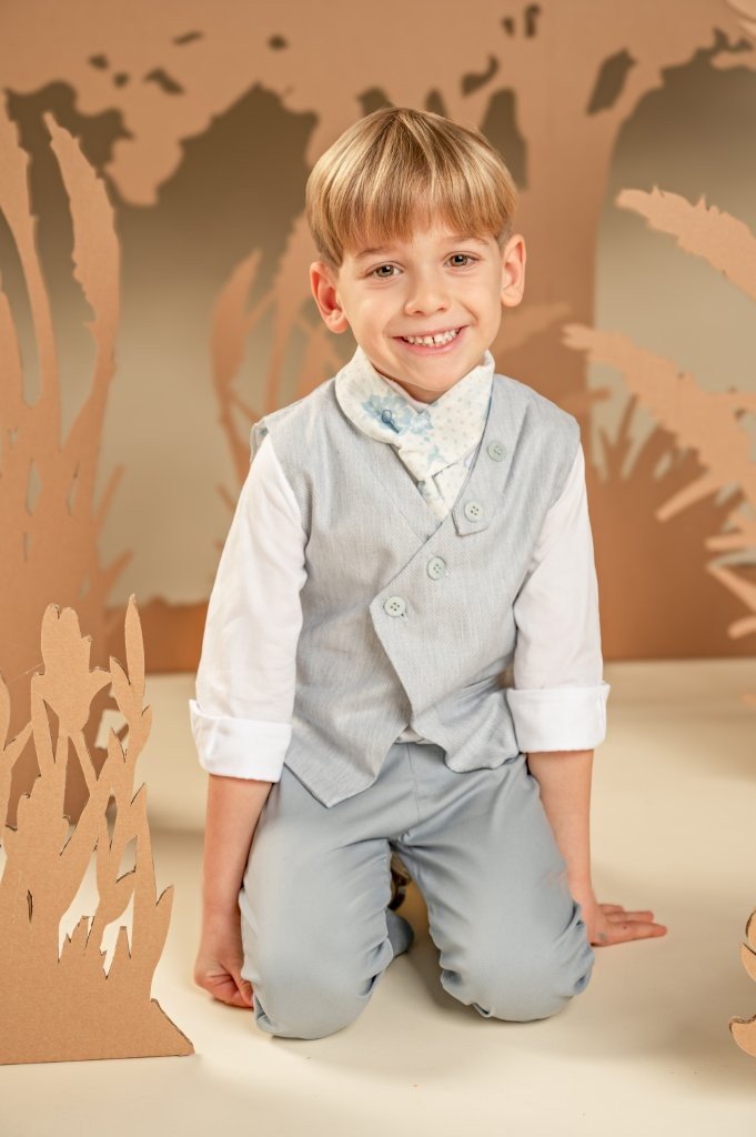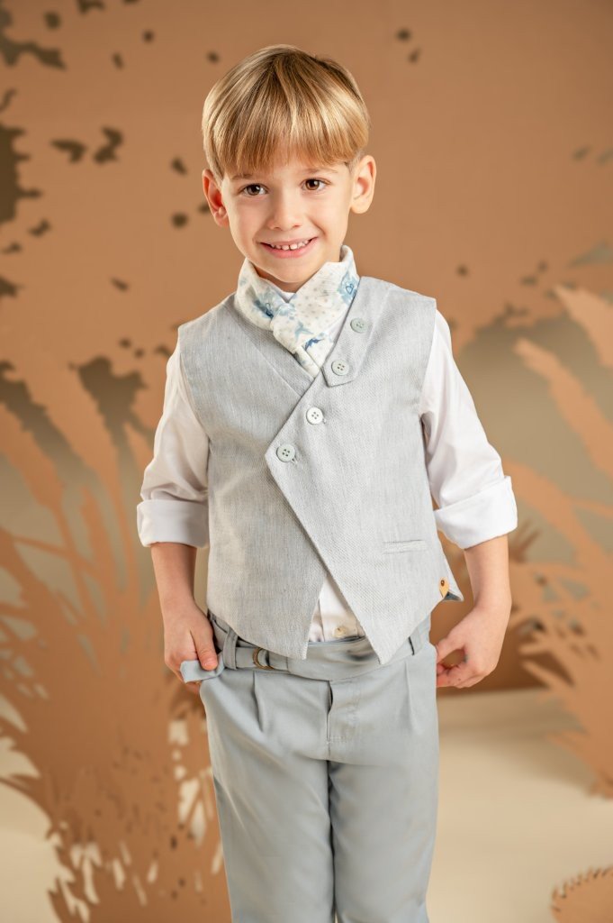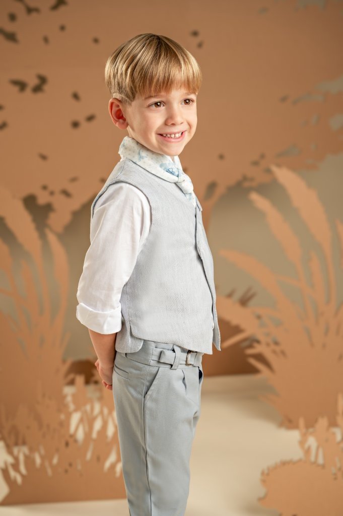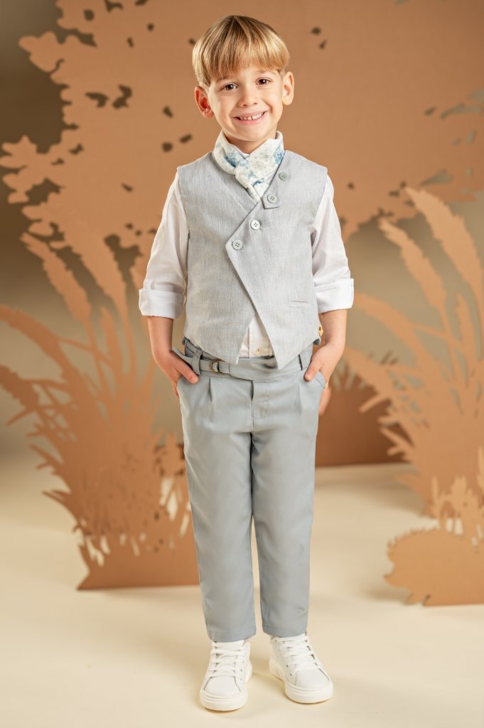 Ένα πανέμορφο σετ που κερδίζει τις εντυπώσεις με  τις απαλές χρωματικές αποχρώσεις και τις κομψές λεπτομέρειες. Παντελόνι από Tencel-viscose ύφασμα σε σιελ-γκρι απόχρωση που ξεχωρίζει για τη μοναδική λεπτομέρεια στη ζώνη και γιλέκο σιέλ από μελανζέ Tencel-cotton-linen ύφασμα με λοξό κούμπωμα και ιδιαίτερο σχεδιασμό. Το λευκό βαμβακερό πουκάμισο με Mao γιακά και το φουλάρι σε σιελ αποχρώσεις με exclusive τύπωμα Baby Bloom ολοκληρώνουν ιδανικά το σύνολο . Για την τελική πινελιά, επιλέξτε ανάμεσα σε ψάθινο καπέλο ή υφασμάτινη τραγιάσκα, ανάλογα με το προσωπικό σας στυλ.