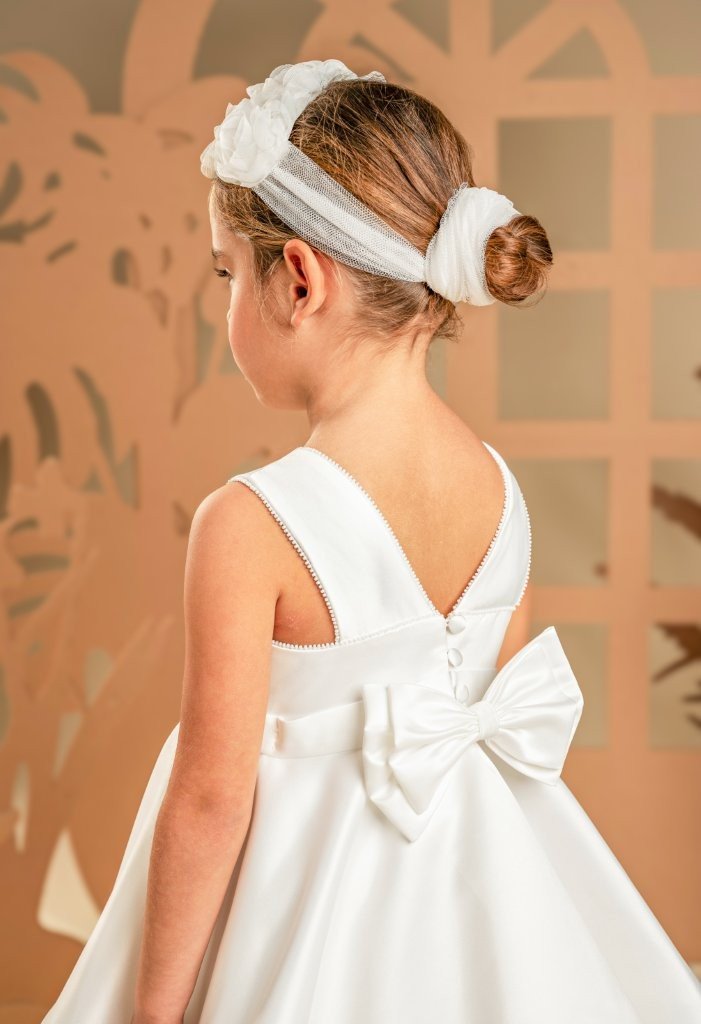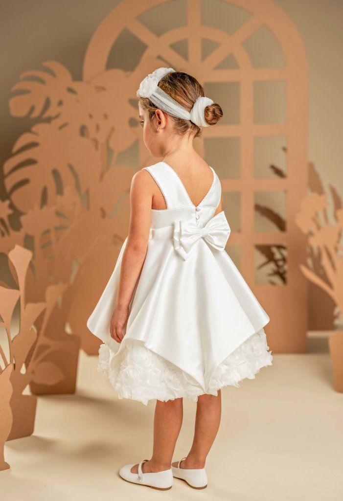 Ένα φόρεμα που συνδυάζει την καθαρότητα της γραμμής με την ποιητική ρομαντική διάθεση σε off white απόχρωση, φτιαγμένο εξολοκλήρου από σατέν ντουσέζ ύφασμα που χαρίζει διακριτική λάμψη. Το μπούστο μπροστά είναι λιτό και αυστηρά καθαρό στις γραμμές ενώ η πλάτη κλέβει διακριτικά την παράσταση με εντυπωσιακές φαρδιές τιράντες, προσθέτοντας σύγχρονη αισθητική στο σχέδιο. Η φούστα ομπρέλα με ασύμμετρες μύτες κινείται με χάρη σε κάθε βήμα, ενώ στο τελείωμά της «ανθίζουν» υφασμάτινα τριαντάφυλλα, μία ρομαντική πινελιά που ισορροπεί ιδανικά με τη λιτότητα του υπόλοιπου σχεδίου. Το σύνολο ολοκληρώνεται με κορδέλα μαλλιών διακοσμημένη με υφασμάτινα αλπικέ τριαντάφυλλά ίδια με του φορέματος, δημιουργώντας μια απόλυτα αρμονική εικόνα.