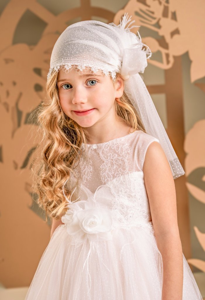 Ένα ονειρικό φόρεμα σε απαλή απόχρωση πούδρας που αποπνέει την απόλυτη έννοια του ρομαντισμού. Το μπούστο είναι φτιαγμένο από μαλακό τούλι,  στολισμένο με υπέροχη ραφινάτη δαντέλα και ντουμπλαρισμένο στο στήθος με ύφασμα από παγιέτες για διακριτική λάμψη. Η ανοιχτή πλάτη στο πίσω μέρος του φορέματος δίνει μία σύγχρονη και εκλεπτυσμένη πινελιά στο σχέδιο. Η φούστα, πλούσια με πολλαπλές στρώσεις από τούλι, καταλήγει σε ουρά και στολίζεται στο τελείωμα με την ίδια δαντέλα του μπούστου. Το φόρεμα ολοκληρώνεται με τούλινη μπαντάνα για το κεφάλι, προσθέτοντας μία ιδιαίτερη fashion-forward πινελιά.