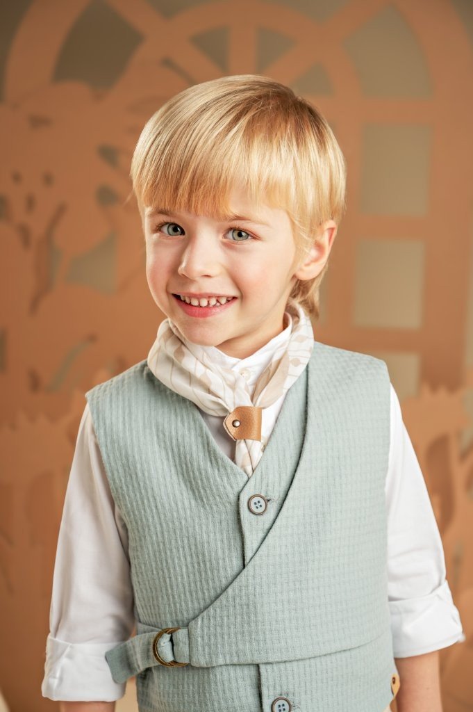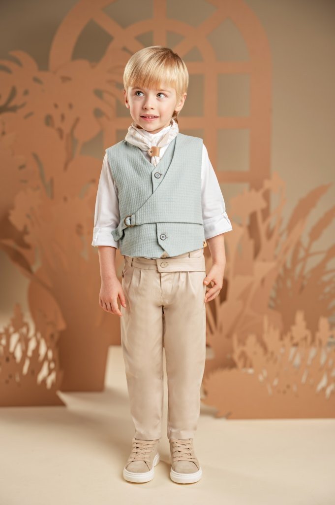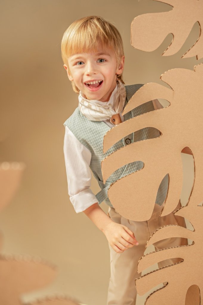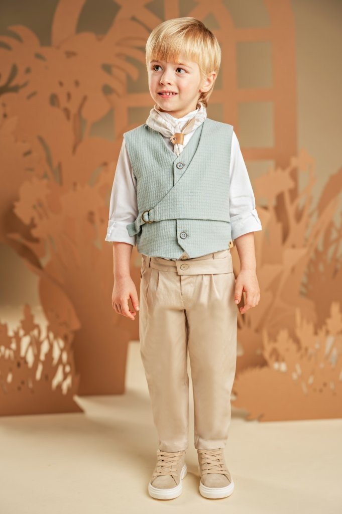Υπέροχο σετ που ξεχωρίζει για τις πρωτότυπες λεπτομέρειες και τα τους γλυκούς παστέλ χρωματισμούς. Το δίπιετο παντελόνι από μπεζ βαμβακερό καμβά με extra λοξή ζώνη συνδυάζεται ιδανικά με το διπλό effect γιλέκο με πλαϊνό κλείσιμο, φτιαγμένο από βαμβακερό πικέ ύφασμα σε σιελ τόνους με ιδιαίτερη πλέξη. Το λευκό βαμβακερό πουκάμισο με Mao γιακά προσθέτει διαχρονική φινέτσα, ενώ το φουλάρι από βουάλ ύφασμα με διακριτικά γεωμετρικά σχέδια ολοκληρώνει το look. Για το τελικό αποτέλεσμα, επιλέξτε ανάμεσα σε ψάθινο καπέλο ή υφασμάτινη τραγιάσκα, ανάλογα με το προσωπικό σας στυλ.