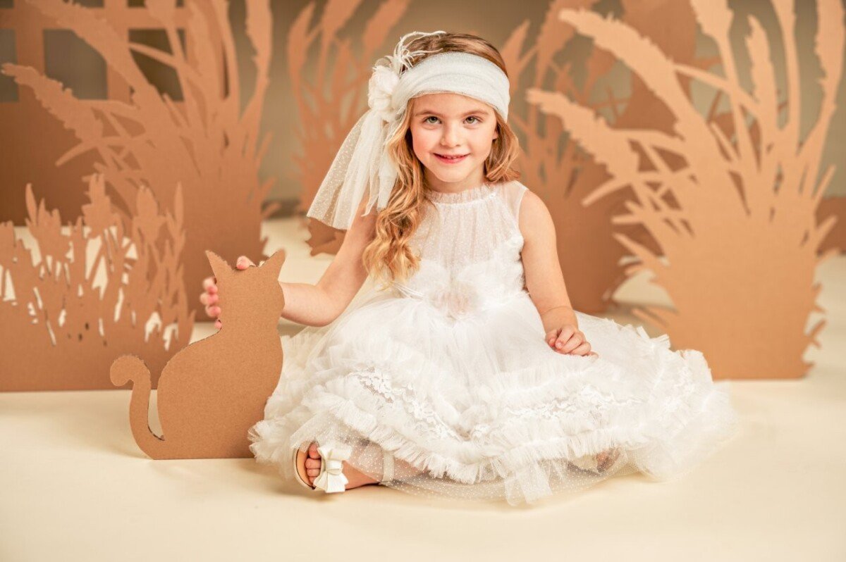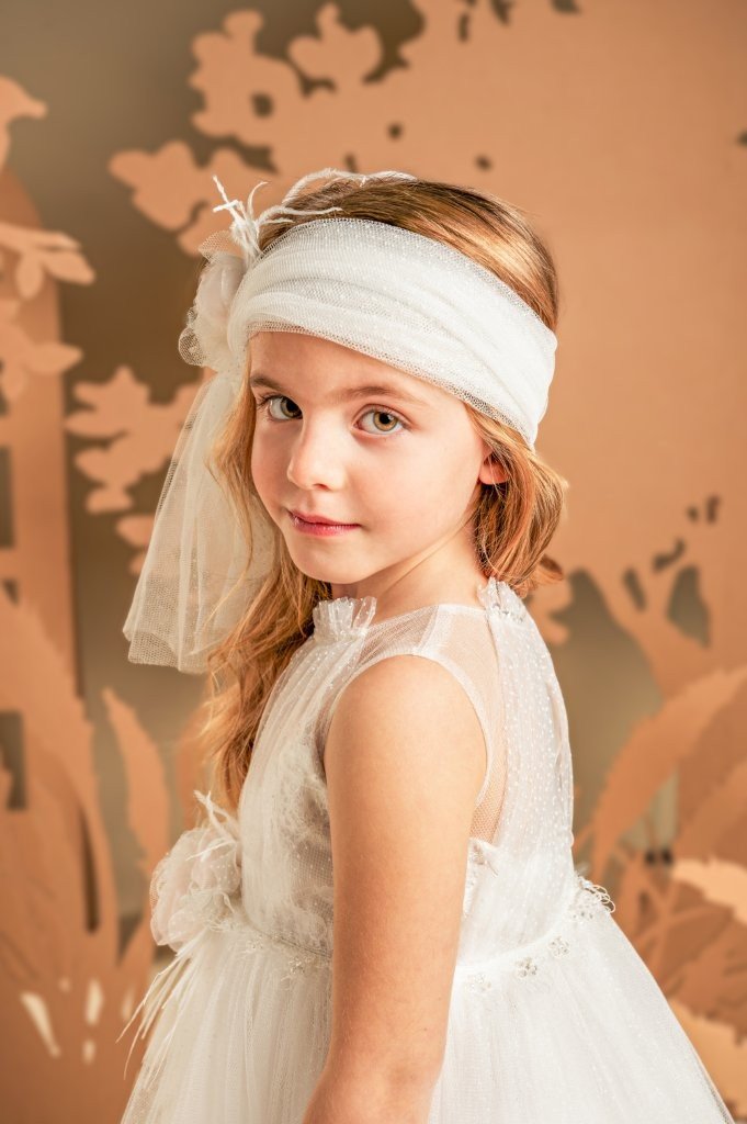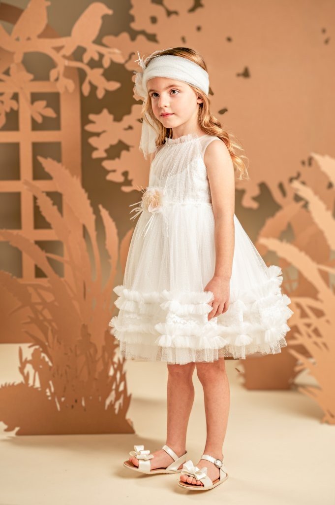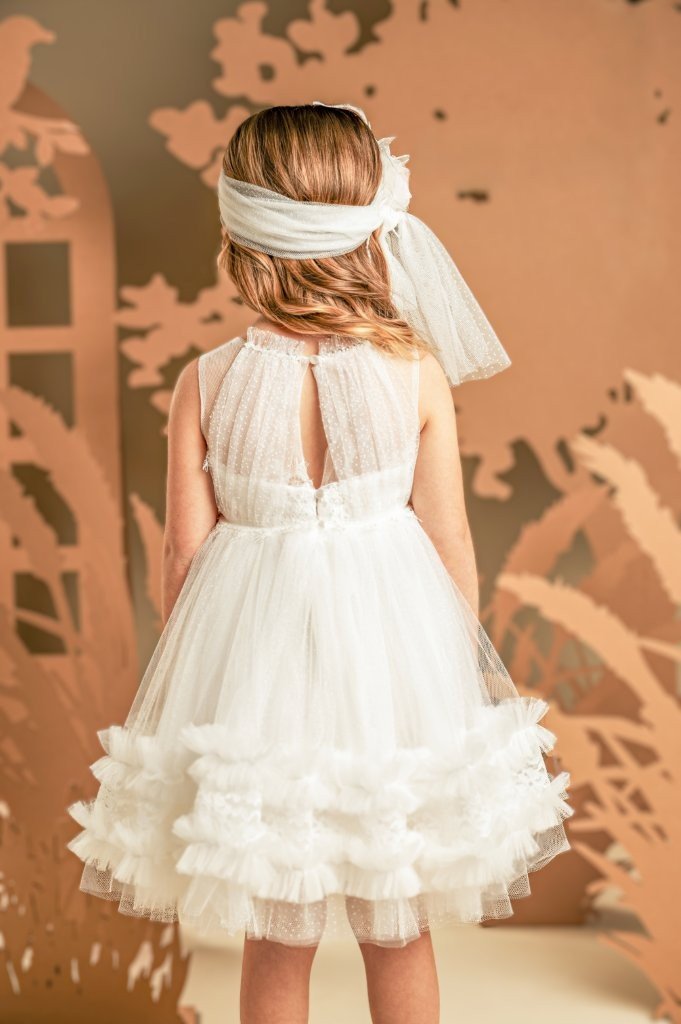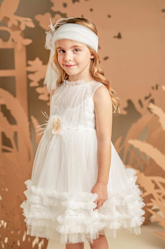 Ένα υπέροχο ανάλαφρο φόρεμα σε off white χρώμα, με μοναδικό σχέδιο και ρομαντική αίσθηση. Το τούλινο διάφανο μπούστο στολίζεται κομψά με ντραπαριστό πουά τούλι και ντουμπλάρεται στο στήθος με γαλλική δαντέλα. Η πλούσια φούστα, με πολλές στρώσεις από μαλακό τούλι, διακοσμείται στο τελείωμα με σειρές από μικρά βολάν και δαντέλα, ενισχύοντας τη ρομαντική φύση του φορέματος. Το σύνολο ολοκληρώνουν ιδανικά η τρέσα με τις χάντρες στη μέση και το χειροποίητο λουλούδι, ίδιο με αυτό που στολίζει την τούλινη κορδέλα για τα μαλλιά.