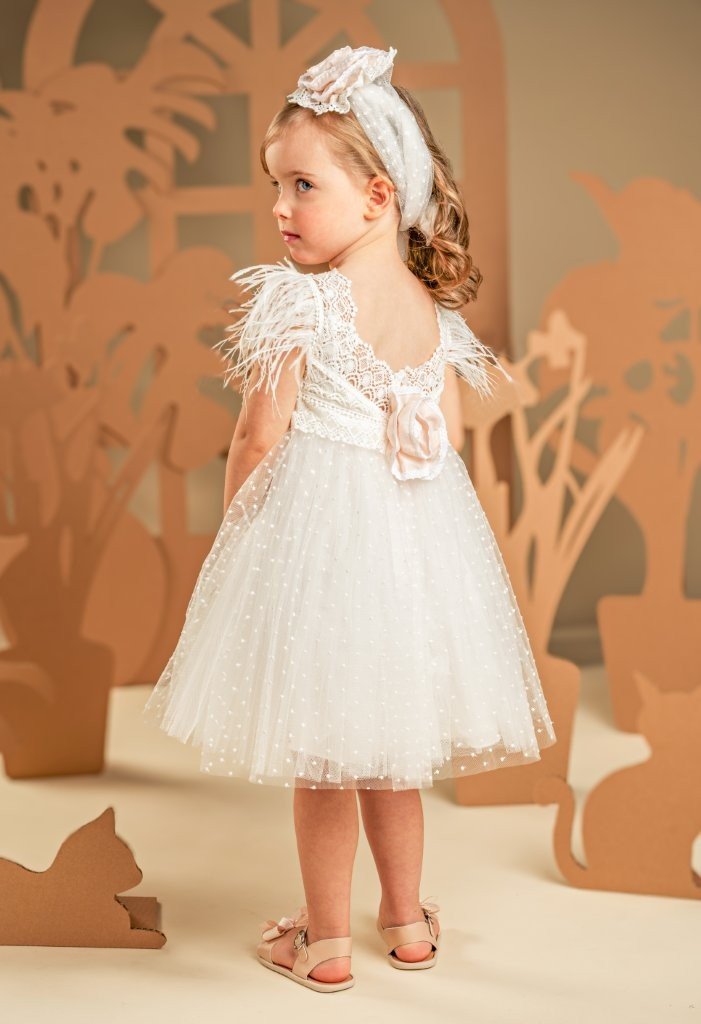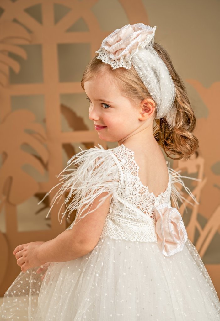 Ένα μοναδικό boho φόρεμα σε λευκό χρώμα με μπούστο από μακραμέ δαντέλα, με υπέροχη «v» πλάτη, φαρδιές τιράντες και φτερά στρουθοκαμήλου, που προσθέτουν μία ανάλαφρη αίσθηση. Η φούστα, πλούσια και αέρινη από πουα τούλι, αποπνέει έντονα ρομαντική διάθεση. Το σύνολο στολίζεται με δύο μεγάλα διακοσμητικά χειροποίητα λουλούδια μπροστά και πίσω στο μπούστο σε Εnglish rose χρώμα, τα οποία στολίζουν και την κορδέλα στο κεφάλι, δημιουργώντας μία ονειρική εικόνα.