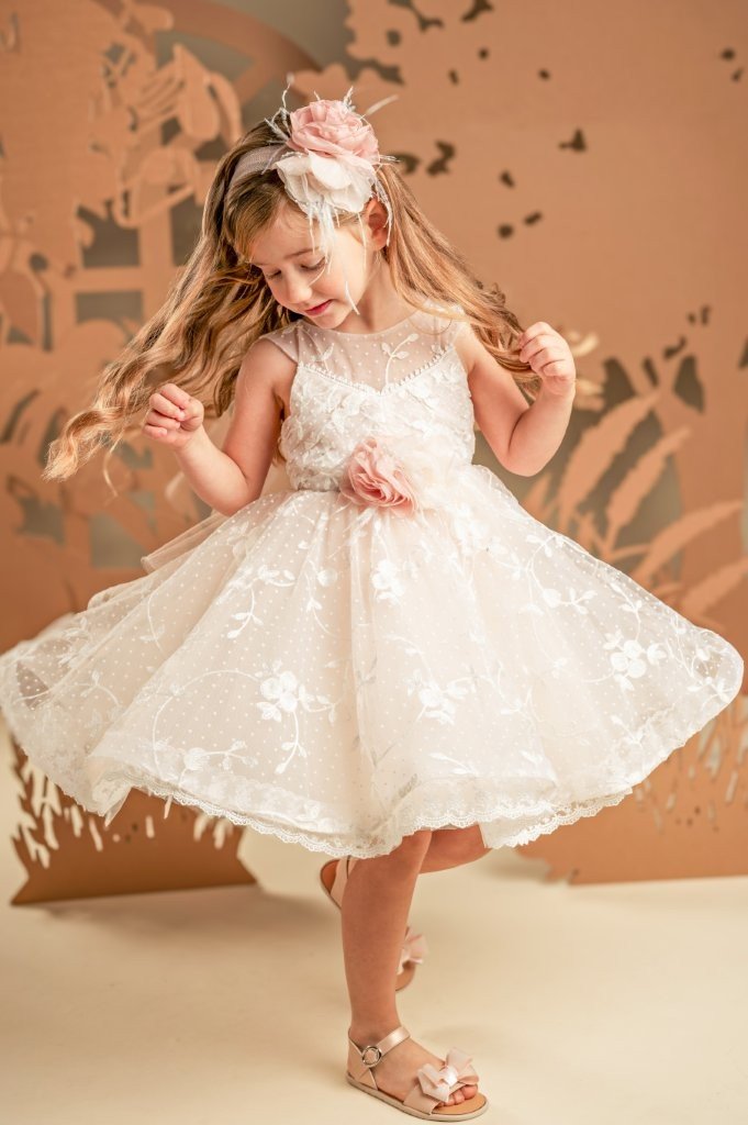 Ένα πανέμορφο ρομαντικό φόρεμα από κεντημένο πουά τούλι σε απαλή απόχρωση πούδρας. Το μπούστο έχει πλισσαριστό ντραπέ, διαφάνεια και εντυπωσιακή διάφανη πλάτη, διακοσμημένη με λεπτές στρώσεις δαντέλας. Η πλούσια κυματιστή φούστα-ομπρέλα, φτιαγμένη από το ίδιο ύφασμα, στολίζεται υπέροχα με χρωματιστά χειροποίητα λουλούδια, ίδια με αυτά που στολίζουν την τούλινη κορδέλα για τα μαλλιά.