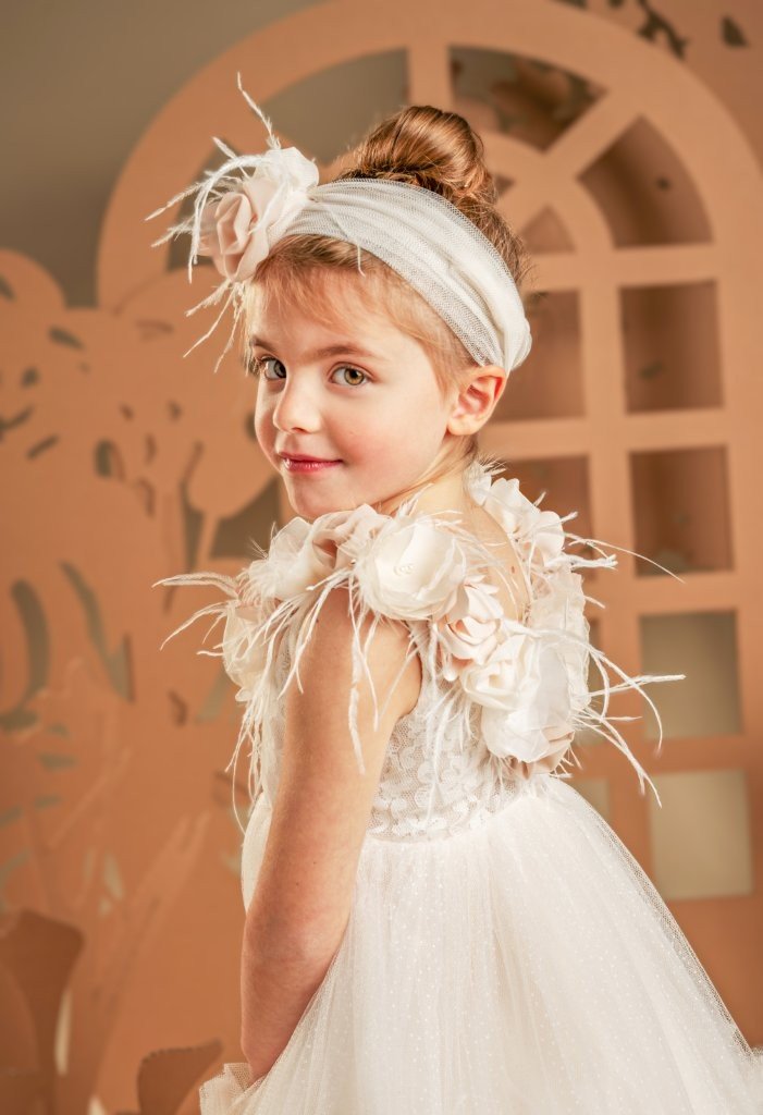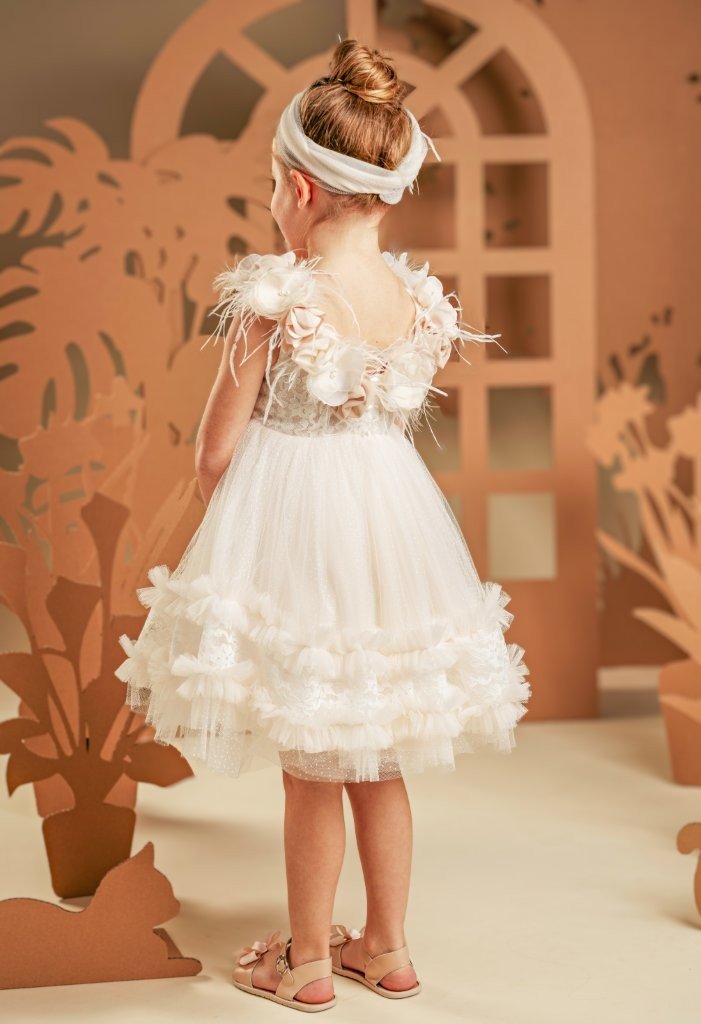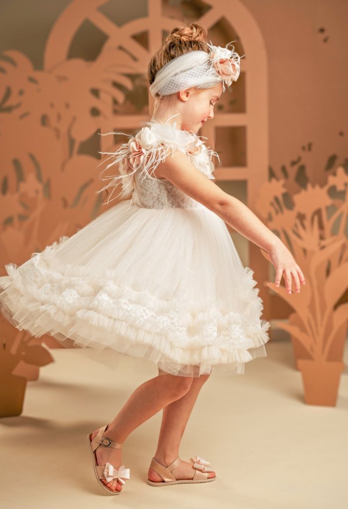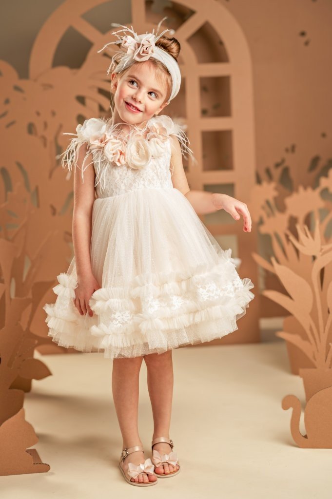 Αυτό το ονειρικό φόρεμα σε αποχρώσεις της πούδρας είναι η επιτομή της ρομαντικότητας. Το μπούστο, φτιαγμένο εξολοκλήρου από ντουμπλαρισμένη δαντέλα, αναδεικνύεται μέσα από την ανοιχτή λαιμόκοψη, περίτεχνα στολισμένη με χειροποίητα λουλούδια εκρού, μπεζ και misty rose. Οι λεπτομέρειες από αέρινα φτερά στρουθοκαμήλου και στρας χαρίζουν μια μαγευτική λάμψη, σαν ψίθυρος πολυτέλειας. Η φούστα, με την πλούσια σούρα από απαλό τούλι και δαντέλα, κινείται με χάρη και ελαφρότητα, ενώ μια σειρά από μικρά βολάν προσθέτει μια παιχνιδιάρικη πινελιά. Η εμφάνιση ολοκληρώνεται με κορδέλα για τα μαλλιά, διακοσμημένη με τα ίδια λουλούδια και φτερά του φορέματος, συνθέτοντας ένα σύνολο που θυμίζει να ξεπήδησε από παραμύθι.