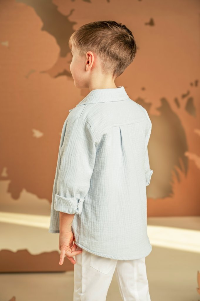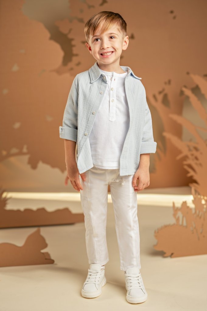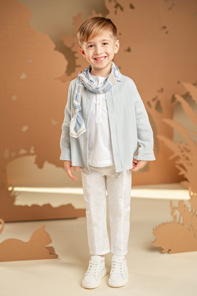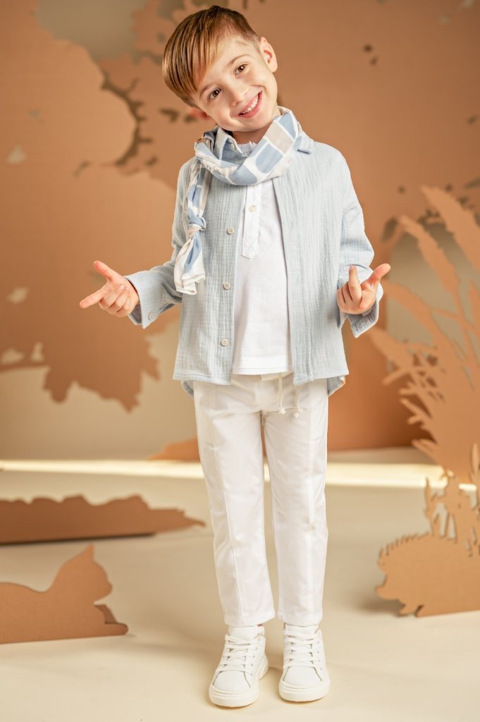 Ένα σύνολο με χαλαρή και σύγχρονη αισθητική, ιδανικό για όσους αγαπούν τις ξεχωριστές εμφανίσεις . Το παντελόνι από λευκή καμπαρντίνα με τα εντυπωσιακά κοψίματα μπροστά και πίσω συνδυάζεται ιδανικά με τη λινή λευκή τουνίκ, προσφέροντας χαλαρή αίσθηση. Το πουκάμισο σε σιελ απόχρωση από βαμβακερό γκοφρέ ύφασμα, αναδεικνύει το layered look και χαρίζει μοντέρνο ύφος. Το φουλάρι σε σιελ γεωμετρικό τύπωμα Baby Bloom exclusive προσθέτει μια ξεχωριστή πινελιά, ενώ για το τελικό αποτέλεσμα μπορείτε να επιλέξετε ανάμεσα σε ψάθινο καπέλο ή υφασμάτινη τραγιάσκα, ανάλογα με το προσωπικό σας στυλ.