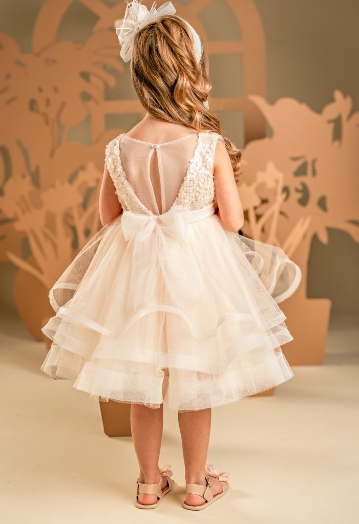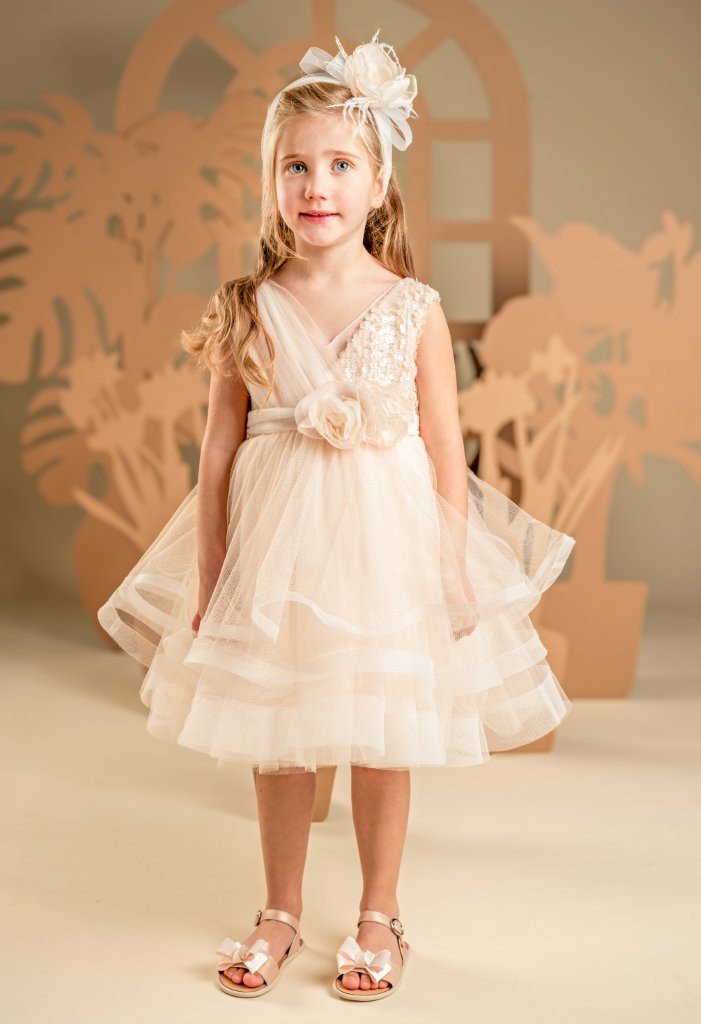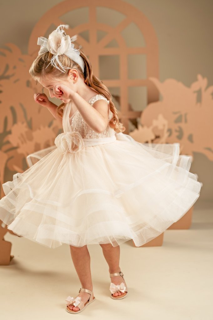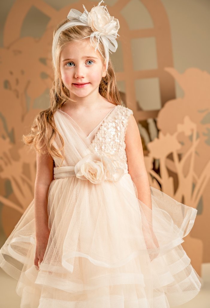 Ένα φόρεμα βγαλμένο από παραμύθι για σύγχρονες πριγκίπισσές, στις γλυκές αποχρώσεις της apricot cream. Το εντυπωσιακό κρουαζέ μπούστο είναι φτιαγμένο από ντραπαριστό τούλι και παγιέτες, ενώ η αέρινη και εκθαμβωτική φούστα δημιουργείται από πολλαπλές στρώσεις τούλι με πλούσιους κυματισμούς που χορεύουν σε κάθε κίνηση. Την εμφάνιση ολοκληρώνει τέλεια η τούλινη ζώνη με τα πανέμορφα χειροποίητα λουλούδια και η κορδέλα για τα μαλλιά, στολισμένη με τα ίδια λουλούδια του ρούχου.