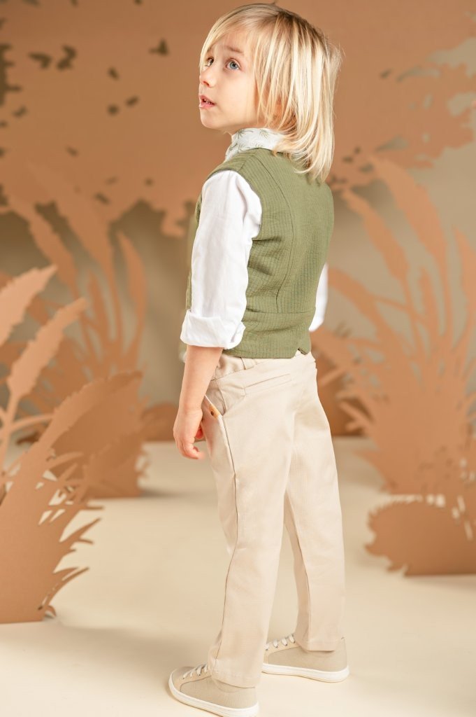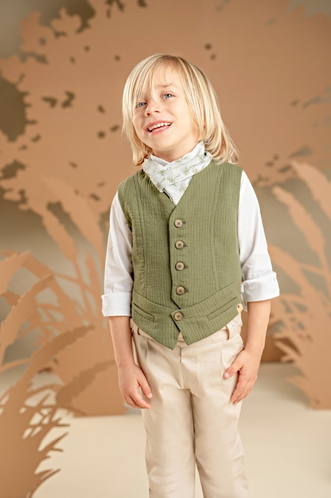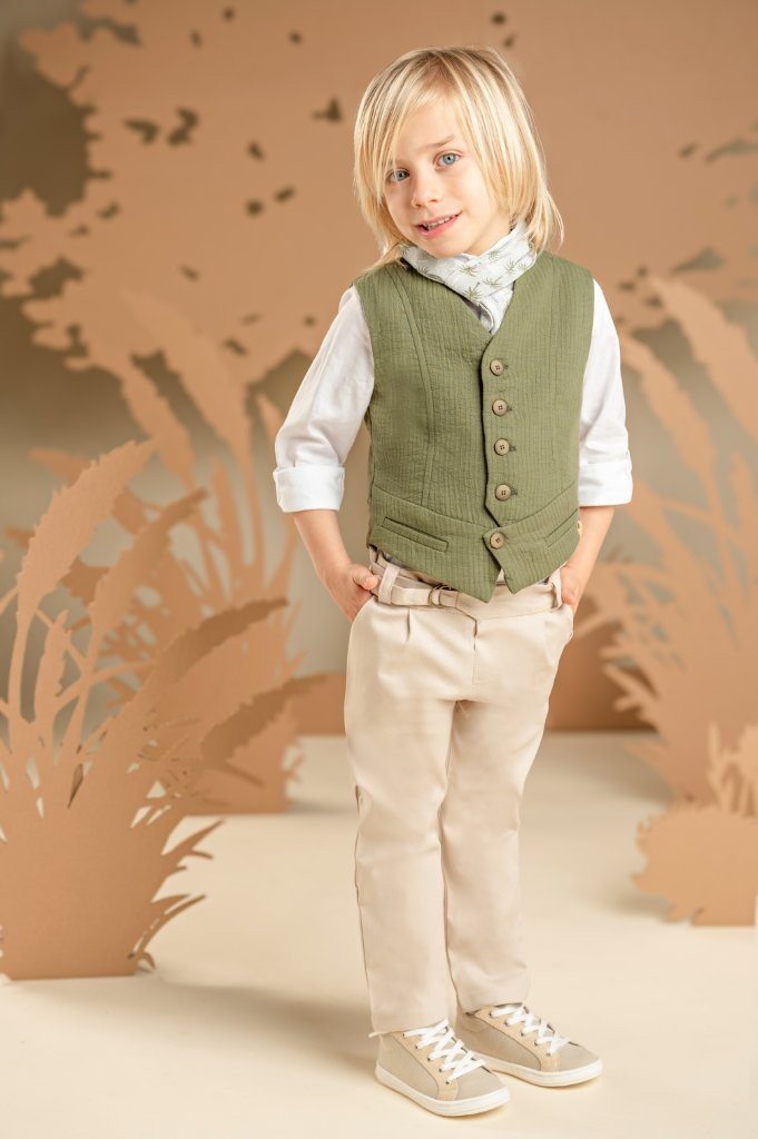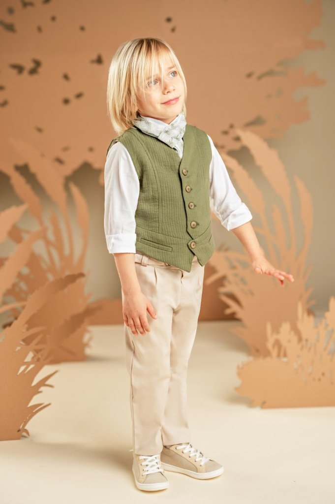 Ένα σετ με μοντέρνο ύφος και προσεγμένες λεπτομέρειες, για μοναδικές εμφανίσεις. Το παντελόνι από μπεζ βαμβακερό καμβά με ιδιαίτερη ζώνη συνδυάζεται ιδανικά με το χακί γιλέκο σε βαμβακερό γκοφρέ ύφασμα με ξεχωριστό σχέδιο. Το λευκό βαμβακερό πουκάμισο με Mao γιακά και το εμπριμέ φουλάρι σε σιελ-χακί τόνους ολοκληρώνει το look. Για το τελικό αποτέλεσμα, επιλέξτε ανάμεσα σε ψάθινο καπέλο ή υφασμάτινη τραγιάσκα, ανάλογα με το προσωπικό σας στυλ.