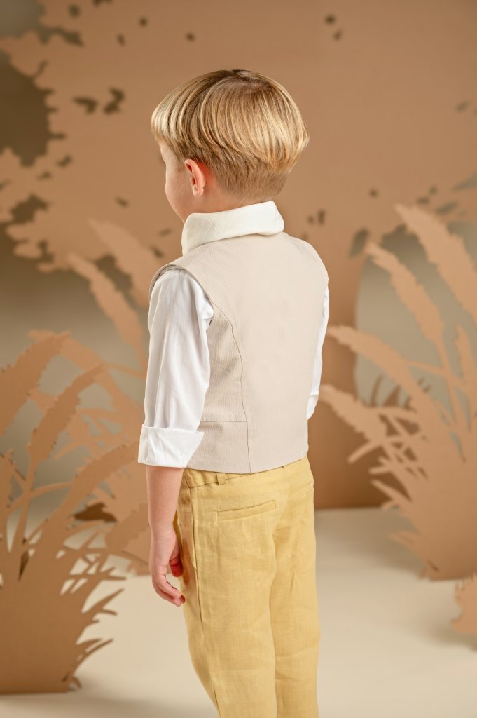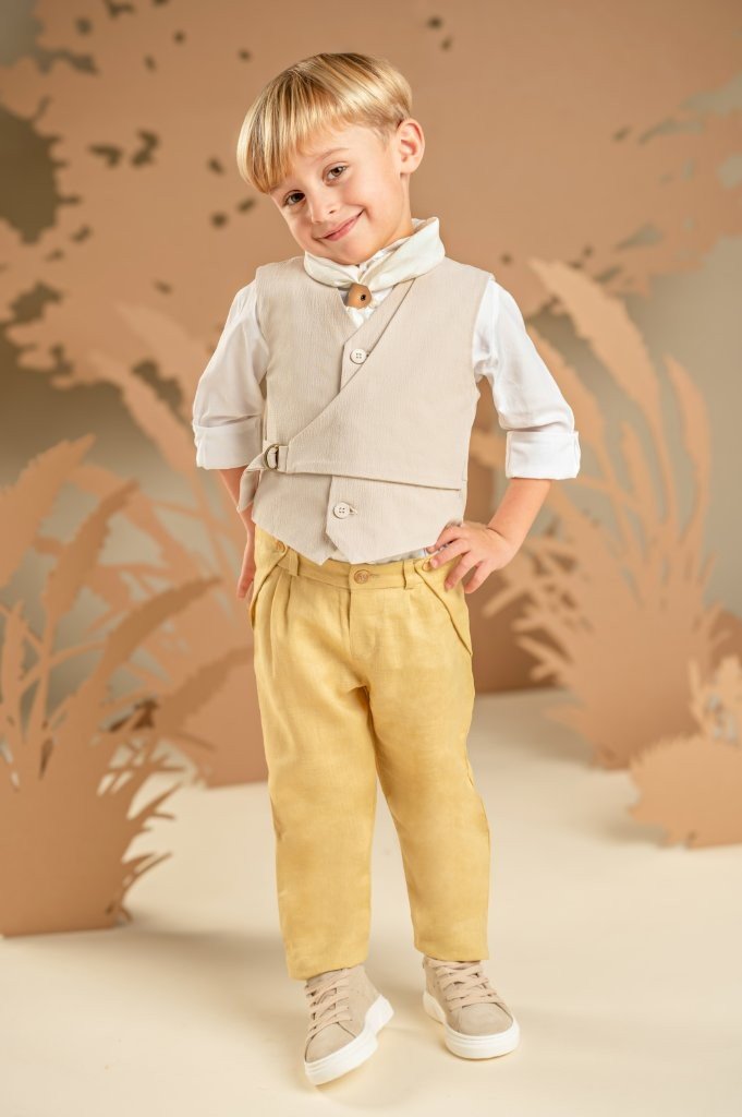 Ένα σετ που συνδυάζει πρωτοτυπία και κομψότητα, ιδανικό για ιδιαίτερες εμφανίσεις. Το λινό παντελόνι σε απόχρωση ginger yellow προσθέτει χρώμα και στυλ, ενώ το διπλό effect γιλέκο με πλαϊνό κλείσιμο, από γκοφρέ βαμβακερό ύφασμα σε μπεζ-γκρι τόνους, ολοκληρώνει όμορφα το σύνολο. Το λευκό βαμβακερό πουκάμισο με Mao γιακά και το τετράγωνο φουλάρι σε λευκό τσαλακωμένο βαμβακερό ύφασμα, προσθέτει μια φρέσκια και μοντέρνα πινελιά. Για το τελικό αποτέλεσμα, επιλέξτε ανάμεσα σε ψάθινο καπέλο ή υφασμάτινη τραγιάσκα, ανάλογα με το προσωπικό σας στυλ.