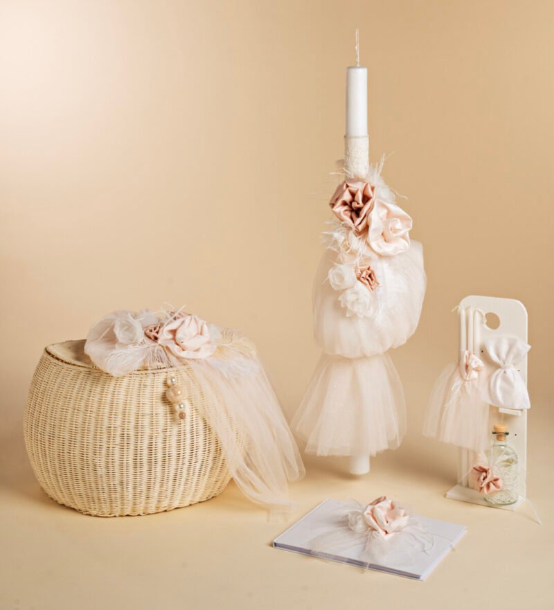 Ψάθινο καλάθι με χειροποίητα λουλούδια και μεγάλα φτερά, λαμπάδα με πλούσια τούλια στο χρώμα της πούδρας, κεραμικές χάντρες και κορδονέ δαντέλες. Συνδυάζονται αρμονικά ευχολόγιο, μπουκάλι λαδιού, κεράκια , σαπουνάκι και ολοκληρώνουν αυτό το ρομαντικό πακέτο.
