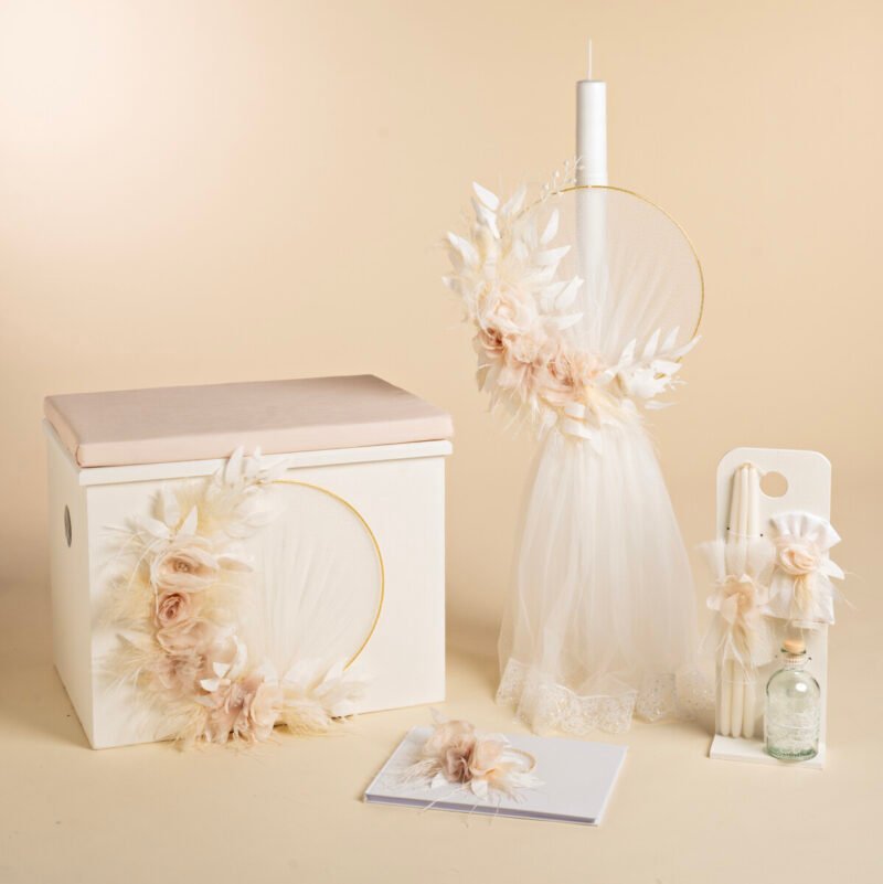 Το συγκεκριμένο πακέτο αποτελείται από ένα ξύλινο κουτί σκαμπό με κύριο χαρακτηριστικό το μεγάλο χρυσό στεφάνι με πλούσια σύνθεση από χειροποίητα λουλούδια και pampas. Η λαμπάδα με το ίδιο στεφάνι και πλούσια τούλια κάνουν ακόμα πιο εντυπωσιακό το αποτέλεσμα. Σέt λαδιού και ευχολόγιο ολοκληρώνουν το πακέτο που σίγουρα θα κάνει τη βάπτιση του παιδιού σας ακόμα πιο εντυπωσιακή και αξέχαστη.