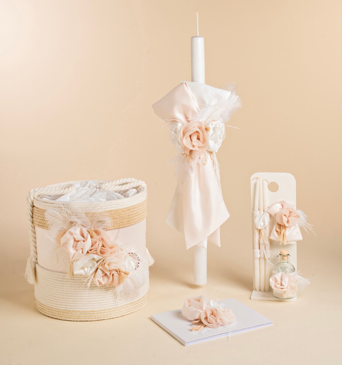 Ένα ξύλινο καλάθι για μια ρομαντική βάφτιση. Λαμπάδα, σετ λαδιού και ευχολόγιο όλα διακοσμημένα με σατέν υφάσματα. Φτερά, χειροποίητα λουλούδια και φυσικά κορδόνια συνδυάζονται αρμονικά σε αυτό το ξεχωριστό πακέτο της φετινής μας συλλογής. Χρυσοκλωστές και μεταλλικά στοιχεία κάνουν τη διαφορά.