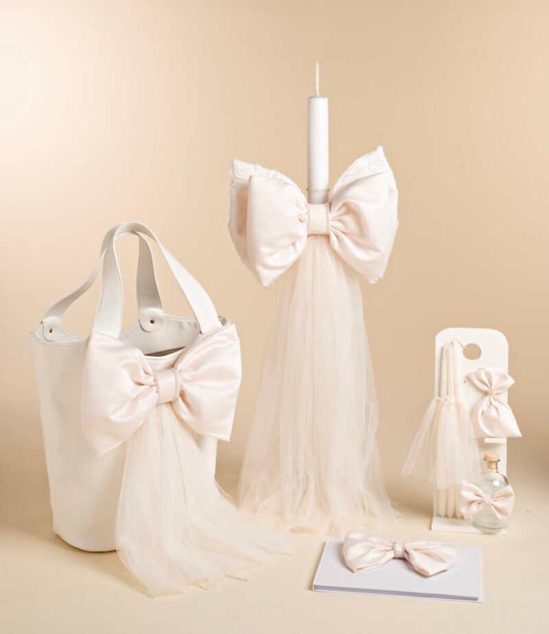 Το πιο χαρακτηριστικό πακέτο της φετινής μας συλλογής. Τσάντα δερματίνη με τύπωμα exclusive Baby Bloom, στολίζεται με ένα μεγάλο φιόγκο από σατέν ύφασμα στο χρώμα της πούδρας. Ξεχωριστή είναι και η λαμπάδα με τον μεγάλο διπλό φιόγκο από δαντέλα και σατέν με πλούσια μακριά τούλια και κρυσταλλένιες τρέσες. Ευχολόγιο με τον ίδιο φιόγκο σε petit μέγεθος και σετ λαδιού ασορτί. Ένα elegant βαπτιστικό πακέτο για μεγάλες απαιτήσεις.