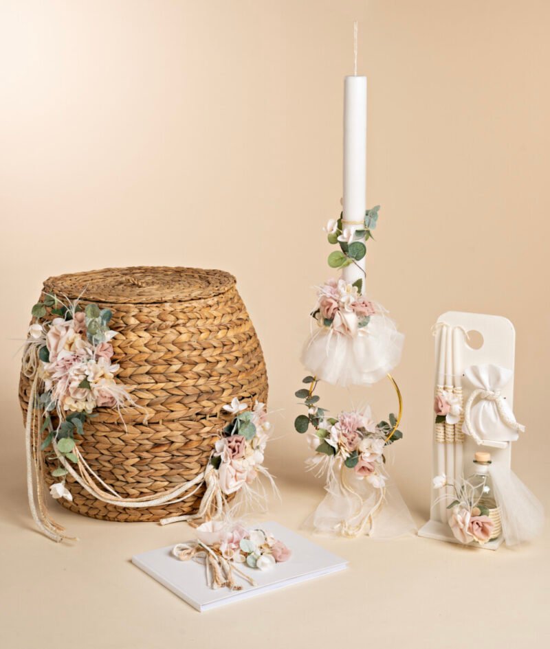 Βαπτιστικό πακέτο που αν είχε όνομα θα ήταν Garden in Bloom. Λουλούδια,φυσικά κορδόνια,  χρυσές λεπτομέρειες και τούλια συνθέτουν ένα αποτέλεσμα βγαλμένο από παραμύθι. Ιδιαίτερη petit λαμπάδα με πλούσιο στολισμό από λουλούδια, σε συνδυασμό με ένα μεγάλο ψάθινο καλάθι με ξεχωριστό στολισμό. Μπουκάλι λαδιού, κεράκια, σαπούνι και ευχολόγιο, όλα αρμονικά συνδυασμένα για ένα εντυπωσιακό αποτέλεσμα.
