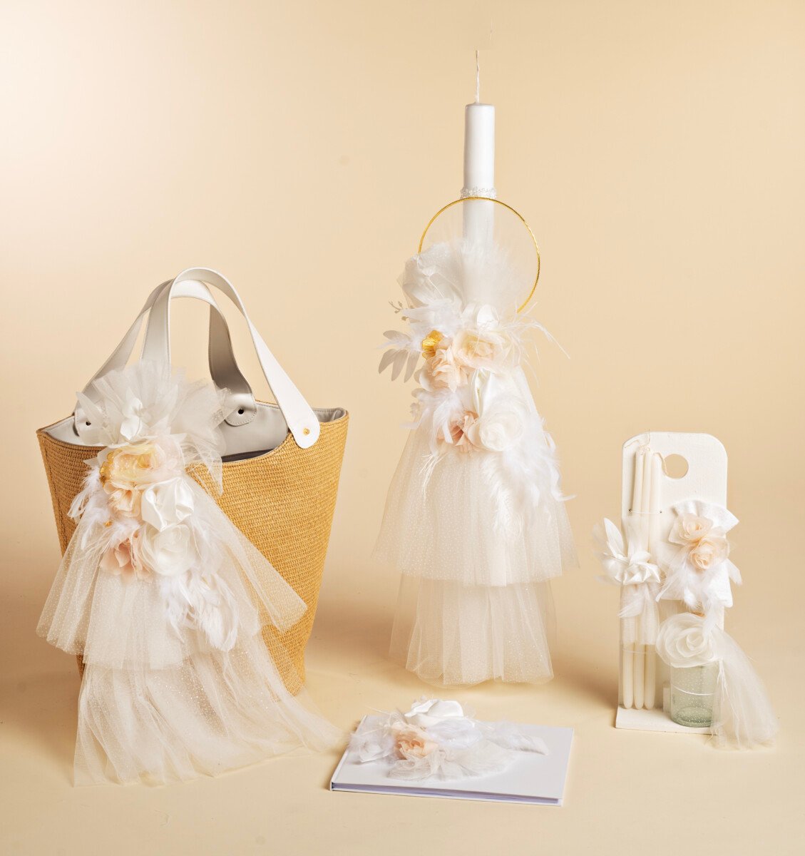Ενα βαπτιστικό πακέτο που θα σας ταξιδέψει. Ψάθινη τσάντα με δερμάτινα χερούλια, στολισμένη με πούα τούλια και λουλούδια στο χρώμα της βανίλιας και του κυκλάμινου, λευκή φτερή και διακριτικά πούπουλα. Λαμπάδα με πλούσια τούλια και χρυσό στεφανάκι με την ίδια σύνθεση λουλουδιών. Σέτ λαδιού σε ξύλινη βάση και ευχολόγιο ασορτί στολισμένα.