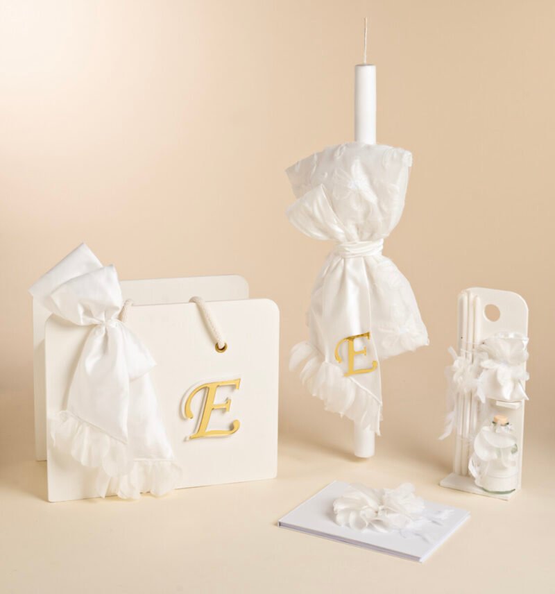 Μίνιμαλ βαπτιστικό πακέτο, συνδυασμός λευκό και χρυσό, ξύλινο κουτί με λευκό υφασμάτινο στολισμό και μονόγραμμα της επιλογής σας, λαμπάδα με κάθετο φιόγκο από φίνα δαντέλα, σέτ λαδίου και ευχολόγιο με λευκά δαντελένια λουλούδια.
