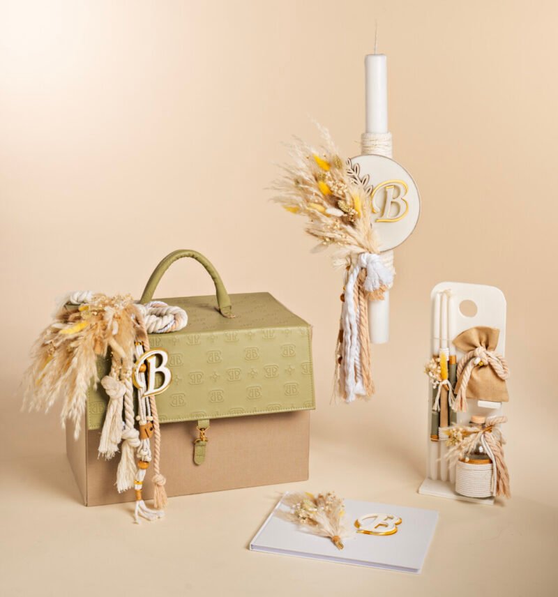 Ενα βαπτιστικό πακέτο που σε ταξιδεύει, τσάντα από δερματίνη, κάμποτ σε αποχρώσεις του φασκόμηλου και του μπέζ. Αγριολούλουδα, φυσικά κορδόνια και μονόγραμμα της επιλογής σας, petit λαμπάδα με ξύλινο διακοσμητικό στοιχείο και ένα πλούσιο μπουκέτο λουλουδιών, σέτ λαδιού σε ξύλινη βάση και ευχολόγιο ασορτί.