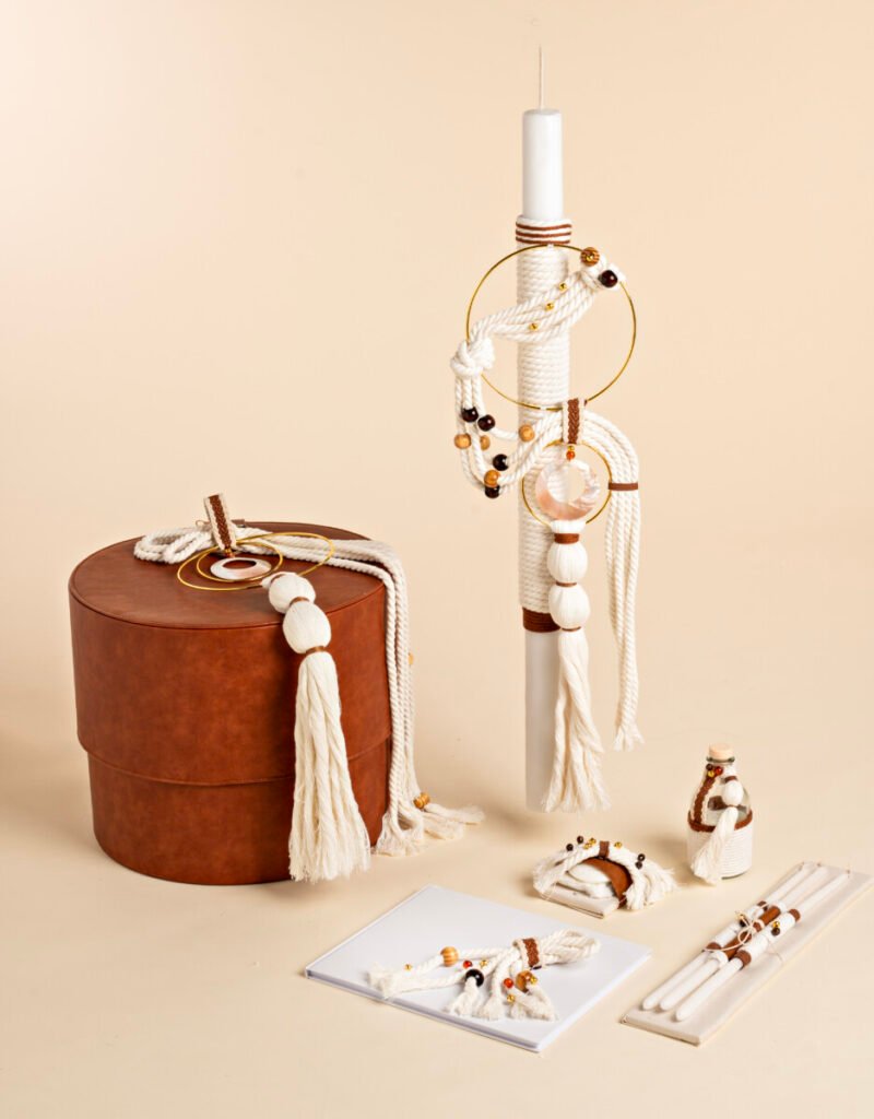 Πακέτο για ιδιαίτερα γούστα, βαρελάκι δερματίνη στο χρώμα του σαφράν και για στολισμό μια σύνθεση κόσμημα από λευκά κορδόνια, χρυσά στεφανάκια, χάντρες και λεπτομέρειες από φίλτεση. Η λαμπάδα ξεχωρίζει για το εντυπωσιακό της design, σχεδιασμένη άψογα με το βιβλίο ευχών και το σέτ λαδιού.