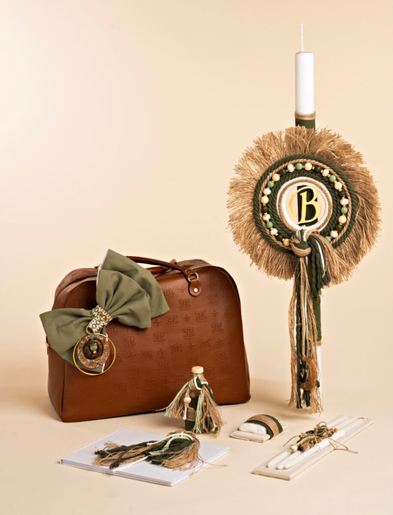 Τσάντα από δερματίνη με το λογότυπο της εταιρείας μας, σε ταμπά απόχρωση με petit στολισμό, με υφάσματα και στοιχεία από φίλντεση. Λαμπάδα στα ίδια χρώματα με στρογγυλό στεφάνι και μονόγραμμα της επιλογής σας. Σετ λαδιού και ευχολόγιο ασορτί.