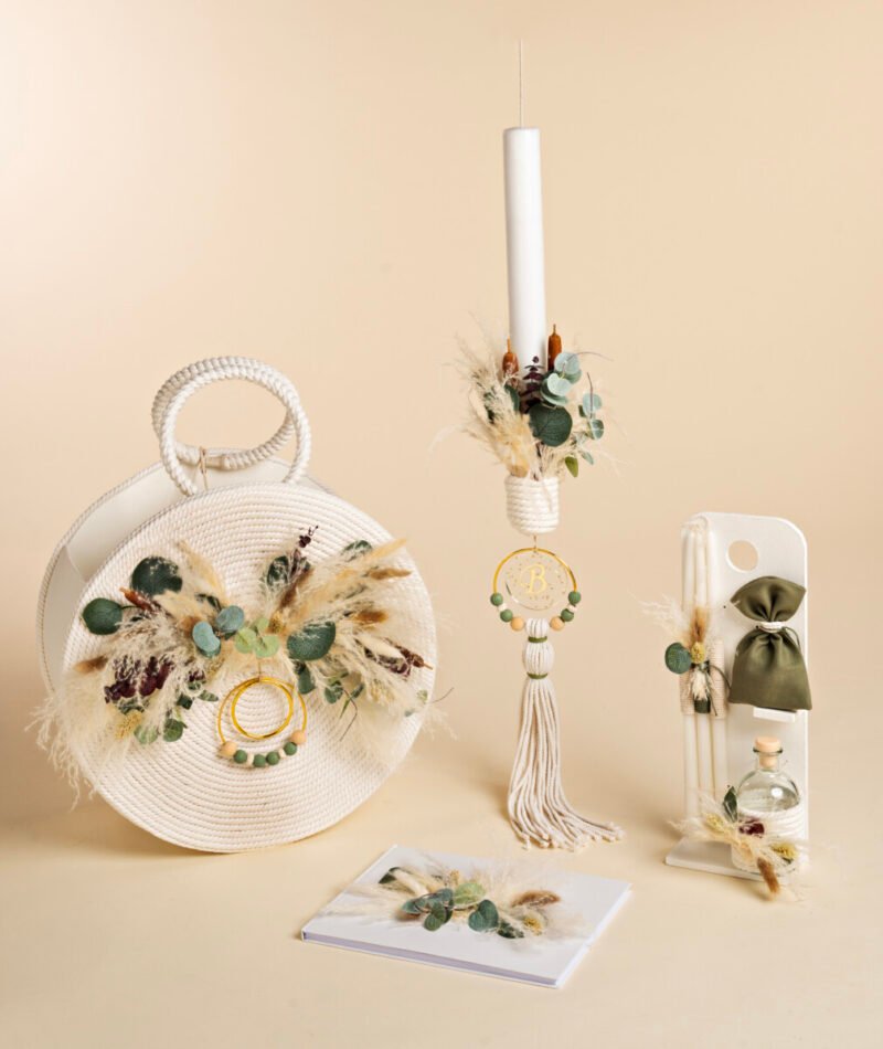 Ξύλινο στρογγυλό κουτί με βαμβακερά κορδόνια και μια ιδιαίτερη σύνθεση από pampas, στάχυα και ευκάλυπτο. Χρυσά στεφανάκια και χάντρες ολοκληρώνουν τον στολισμό. Ιδιαίτερη petit λαμπάδα με την ίδια σύνθεση και μια μεγάλη βαμβακερή φούντα στο τελείωμα. Υγρό γυαλί με το μονόγραμμα της επιλογής σας, σετ λαδιού και βιβλίο ευχών ασορτί.