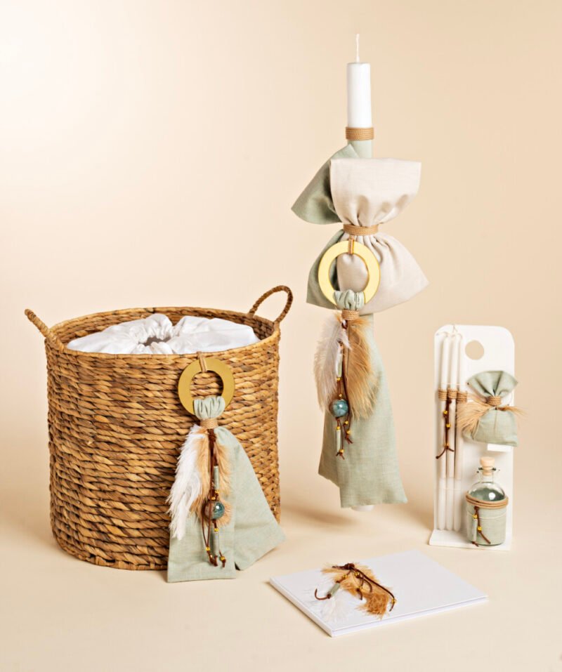 Η μεγαλύτερη τάση για φέτος, βαπτιστικό πακέτο στο χρώμα της μέντας, ψάθινο καλάθι με κορδόνια και υφάσματα, στο κέντρο ένας στολισμός με υφάσματα και ένα δέσιμο με χρυσό plexiglass στοιχείο και φτερά μαραμπού, λαμπάδα με petit φιόγκο και το ίδιο στοιχείο από plexiglass, σετ λαδιού και βιβλίο ευχών ασορτί.
